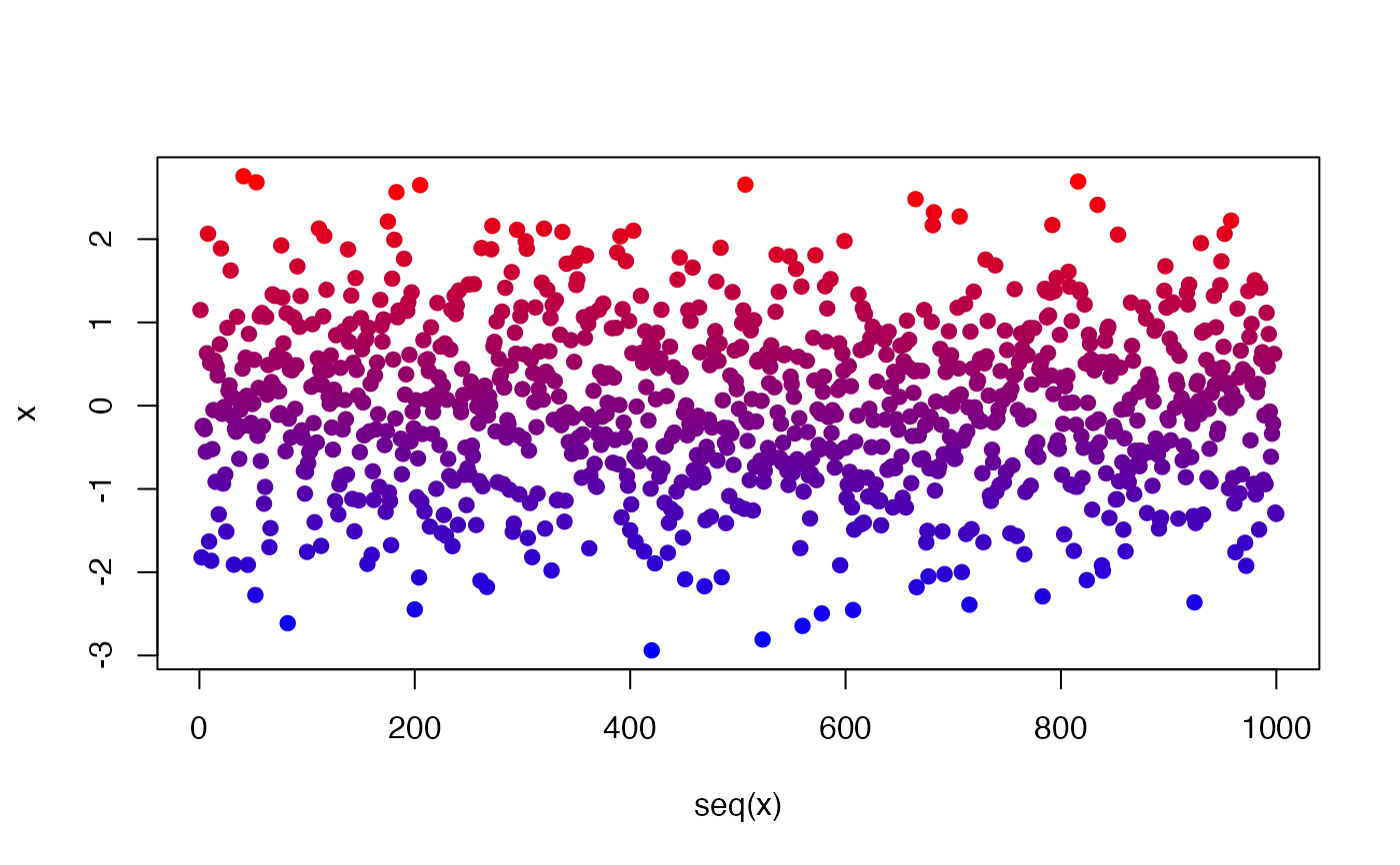 Numeric value(s) to convert to colors (e.g., a vector of heights).